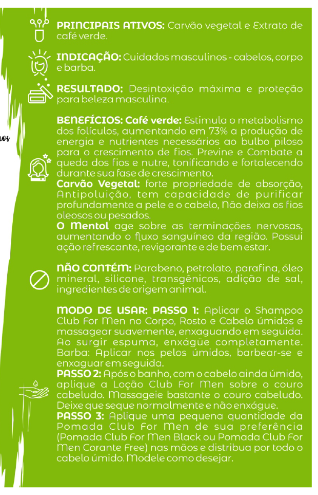 A linha Club For Men possui extrato de café verde e carvão vegetal que estimulam o metabolismo dos folículos, aumentando em 73% a produção de energia e nutrientes necessários para o crescimento capilar.Prevenindo e combatendo a queda dos fios enquanto nutre, tonifica e fortalece!