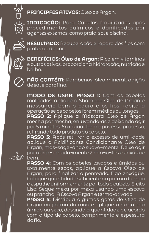 Indicado para uso diário e para uso pós-química, o Òleo de Argan reequilibra o pH dos fios, devolvendo as cargas positivas para o cabelo não ficar “elétrico”, condiciona e sela as escamas. Formulado com Óleo de Argan assim, potencializa as hidratações e reconstruções, mantendo os nutrientes e outros ativos dentro das fibras capilares, para um efeito mais intenso proporcionando um resultado profissional.
