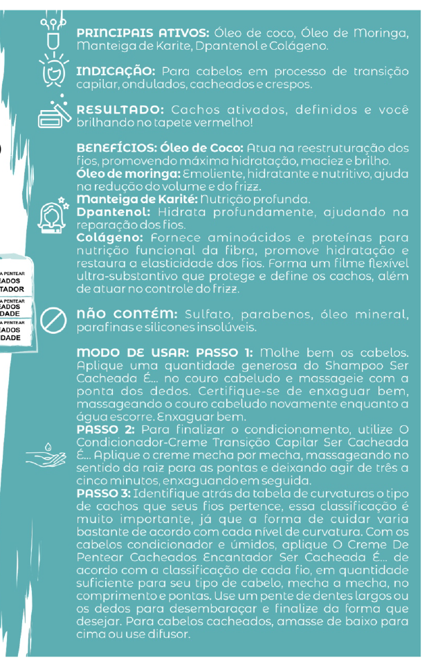 Possui um mix de Ativos Especiais: Óleo de Coco, Óleo de Moringa, Manteiga de Karité, D-Pantenol e Colágeno. O Creme para pentear para cabelos cacheados foi desenvolvido para cabelos com cachos mais fechados e tendência ao crespo ou em transição. Sua fórmula leve, especialmente desenvolvida para cabelos com curvatura 3B – 3C define os cachos, protegendo contra os raios solares nocivos aos fios, hidrata e cuida dos cabelos, para um visual perfeito e tão natural quanto você esperava, desembaraço perfeito, efeito e nada de frizz! RESULTADO PROFISSIONAL.